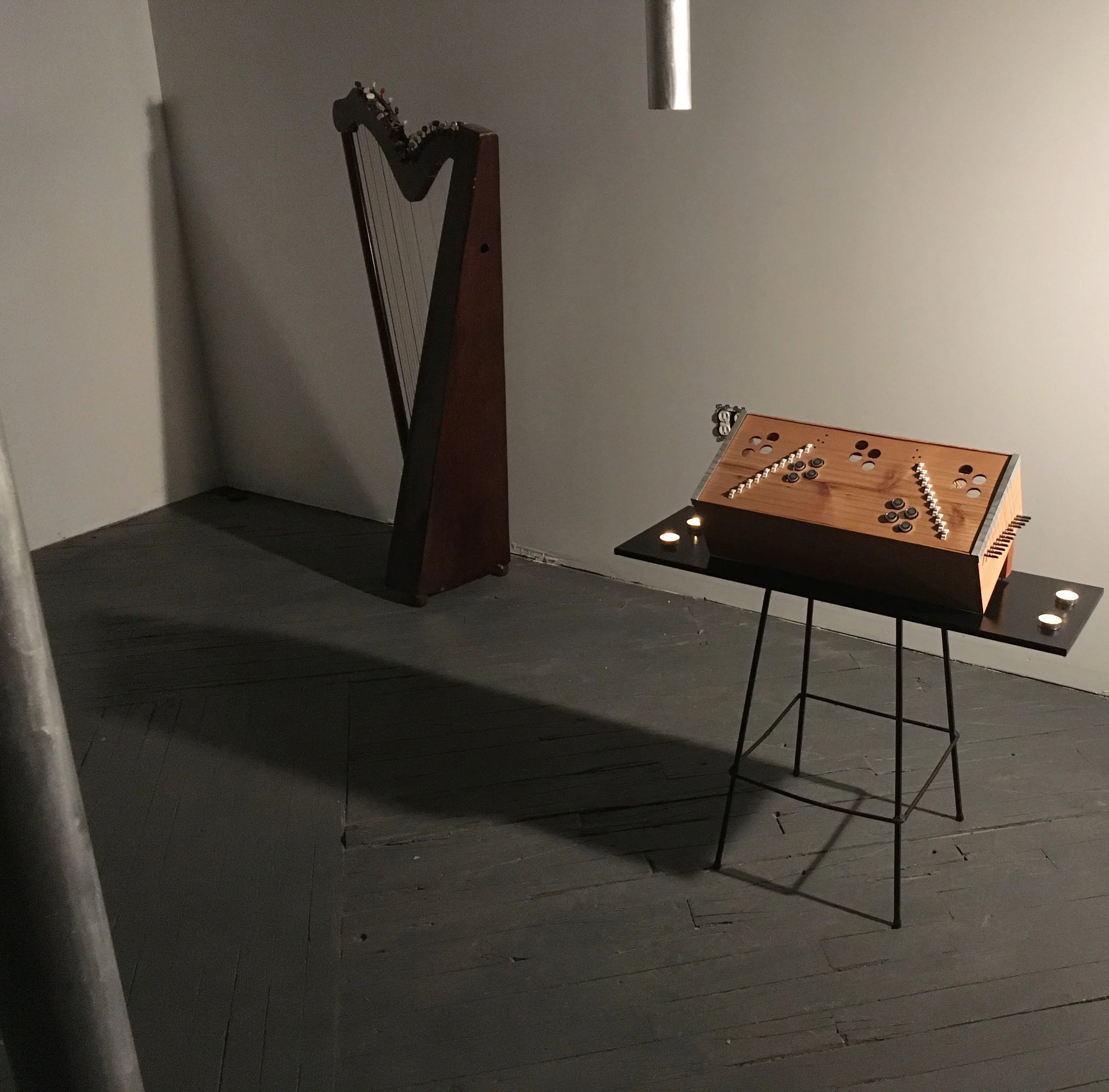 Fire-scorched spruce, butternut, steel, birch, electromagnets, 3D-printed PLA, steel strings.